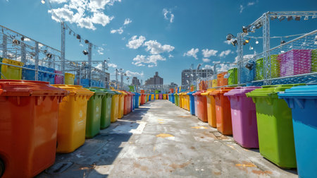 A line of colorful recycling bins and trash cans stand under a bright blue sky, creating a vibrant pattern that represents environmental awareness and sustainability.