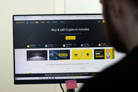 New York, USA - 26 April 2021: Binance website page on screen, man using service, Illustrative Editorial