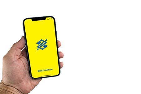 Male hand holding a smartphone with Banco do Brasil (Bank of Brazil) app on screen. White background. Rio de Janeiro, RJ, Brazil. July 2021.