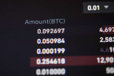 Shallow depth of field footage with details of Bitcoin cryptocurrency on a crypto exchange app, on a digital screen.