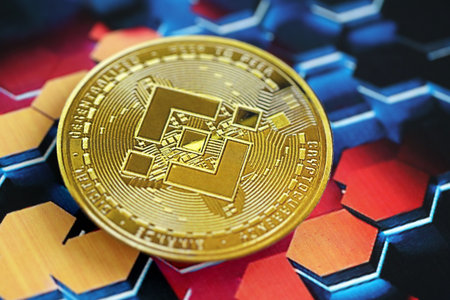 Coin cryptocurrency binance on bitcoins background. BNB.