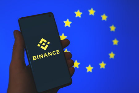 Binance app logo on smartphone in hand with the blurred European Union flag background. Binance in Europe, EU regulations news. Crypto exchange, trading platform. Swansea, UK - July 31, 2021.