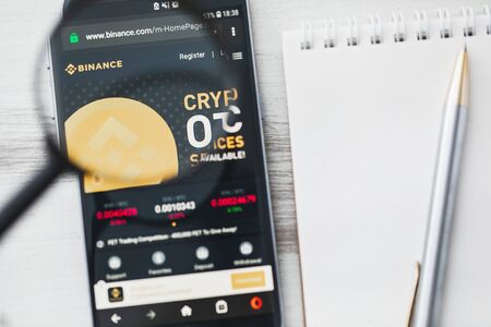 Valletta, Malta - 15 January 2020: Binance official website homepage under magnifying glass. Concept Binance Cryptocurrency exchange logo visible on tablet screen, smartphone