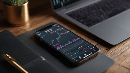 A wooden financial desk displaying live analysis on a laptop accompanied by research and coffee.