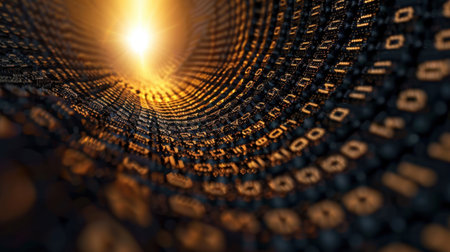 Binary digits swirling in vortex, creating mesmerizing visual effect that symbolizes flow of data and technology. warm glow at center adds sense of depth and intrigue