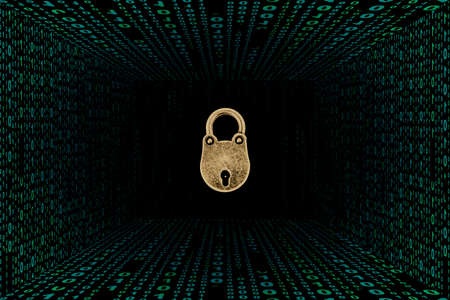 closed padlock in front of green matrix and circular lines background. cyber and computer security concept. privacy protection against hackers, virus and spyware.