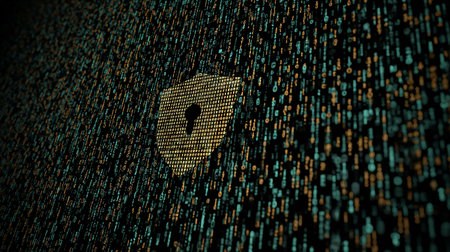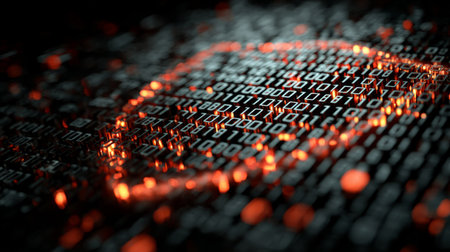 A visually striking abstract representation featuring a lock shape interwoven with binary code, symbolizing cybersecurity and data protection themes.