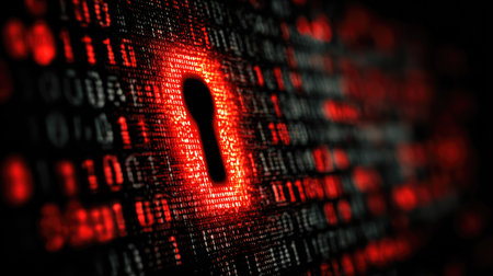 Vibrant crimson patterns of luminous ones and zeroes cascade in a dynamic flow, evoking a high-tech environment centered on digital security and advanced innovation.