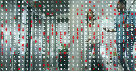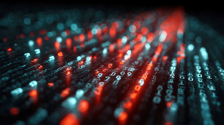 A close-up view of a digital display showing rows of red and white binary code numbers. Clear details and vibrant colors...