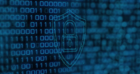 Image of binary code over lights and digital shield with padlock. Internet, network, data processing, digital security and technology concept digitally generated image.