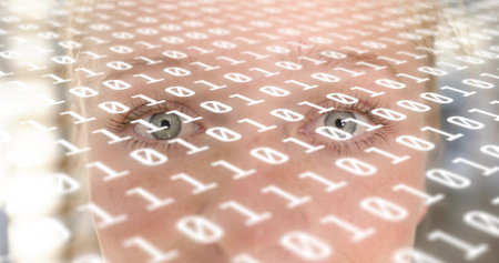 Holding steady forward gaze, adult female face in studio showing irises, eyelashes, binary overlay. Portrait, woman, digital, tech, code, matrix, futuristic