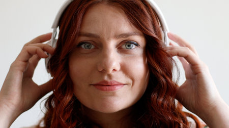 A captivating close-up of a young woman with headphones, lost in the joy of music. Her natural beauty shines through as she expresses happiness and relaxation in an urban setting.
