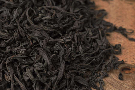 Extreme macro Black loose leaf tea as a background. Texture of dry black tea leaves in shallow depth of field. Dark background. macro mode. black leaf tea closeup