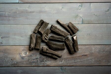 Black color wooden charcoals on dark background top view angle which made from real nature that use for cooking or heating or fire camping or absorb odor in room or refridgerator.