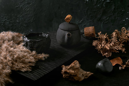Traditional handmade ceramic black teapot with wooden handle on dark tea table. Ceramic teacups and dried reed flowers side by side.