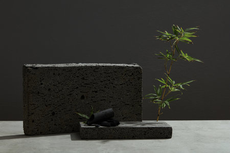Front view of bamboo charcoal, stone and green leaves on dark background. Space for product presentation