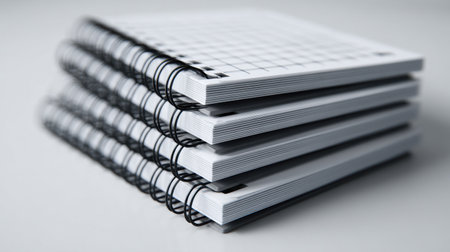 Four neatly stacked spiral-bound notebooks with blank pages rest on a smooth surface, highlighting a clean and minimalist design that promotes organization.