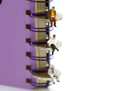 Miniature people: Businessman reading newspaper and sitting on book using as background education or business concept.