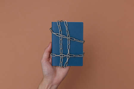 Hand holding Passport wrapped in a metal chain on brown background. top view