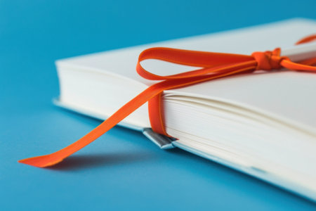 Travel journal with orange ribbon on blue background for creative writing and inspiration