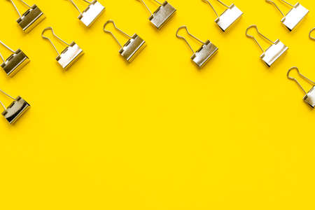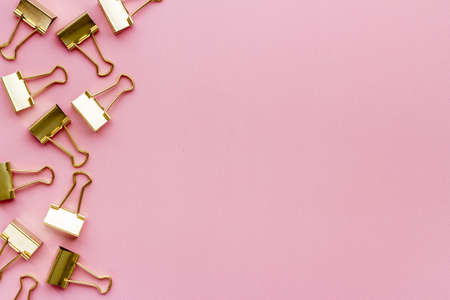 Frame of stationery golden paper binder clips top view. Office supplies pattern