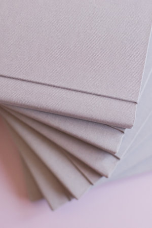 This image captures a close-up view of stacked paper sheets featuring a soft texture and neutral tones. The gray surface creates a subtle contrast.