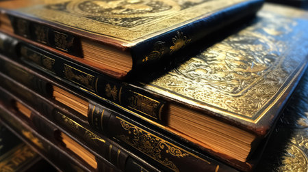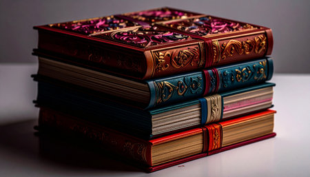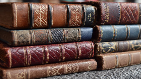 Stacked vintage books with leather covers on wooden surface, displaying detailed textures and colors, illuminated by gentle light, evoking a sense of nostalgia and warmth, AI generated