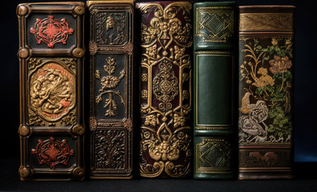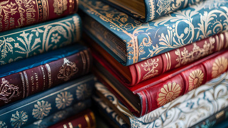 A stack of classic hardcover books with cover designs and a vintage antique aesthetic The books feature ornate patterns textures and that evoke a sense of literary tradition and cultural heritage