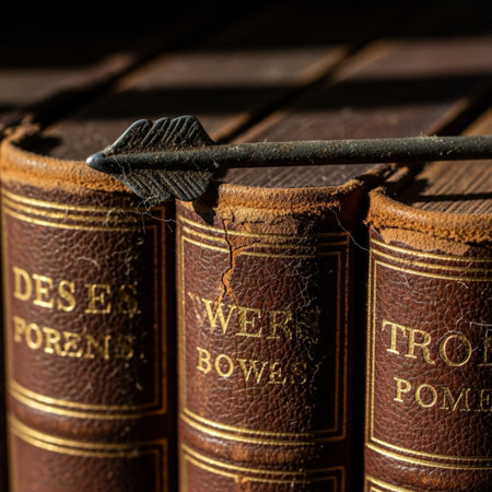 Macro detail of a cupid's arrow resting on dusty, scratched antique leather books in harsh sunlight.