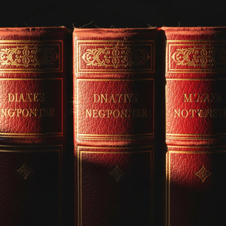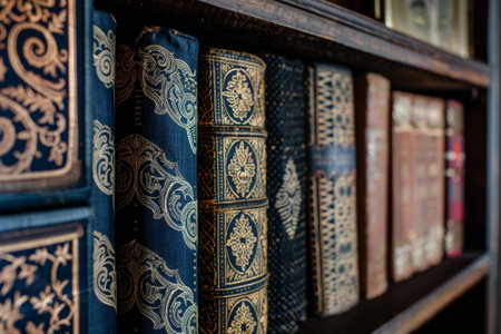A row of books with gold embossing on the spine. The books are arranged on a shelf