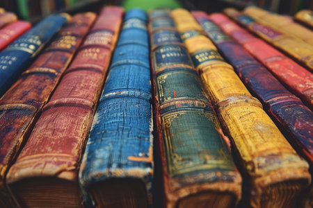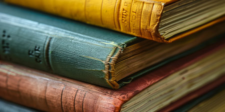Close-up of a stack of vintage books with worn covers and aged pages, symbolizing knowledge, history, and timeless literature