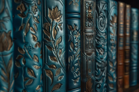 A row of blue leather bound books with gold leaf designs. The books are lined up on a shelf