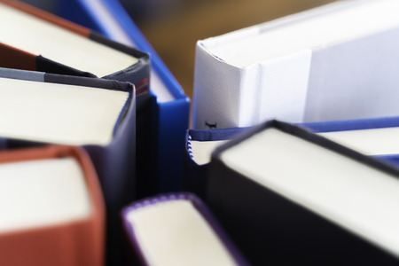 Close-up of book stack. Several colorful books with selective focus. Education concept