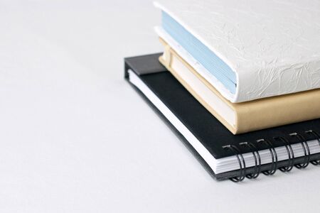 Education Creativity concept. Red, blue and black notepads on a light wooden background, close up