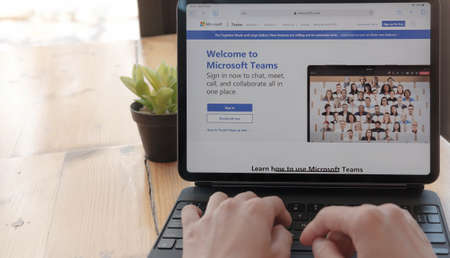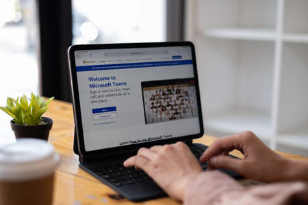 CHIANG MAI, THAILAND - Mar 21, 2021 : Business woman using Microsoft Teams social platform on tablet, ready for remote working in isolation from home.