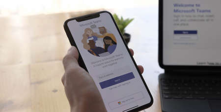 CHIANG MAI, THAILAND - JUN 7 , 2020 : A girl mobile phone ready to use Teams to hold online classes. There has been a surge to Teams in the THAI and Asian recently due to Coronavirus lockdowns.