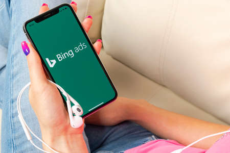 Sankt-Petersburg, Russia, May 30, 2018: Bing application icon on Apple iPhone X screen close-up in woman hands. Bing ads app icon. Bing ads is online advertising application. Social media network.
