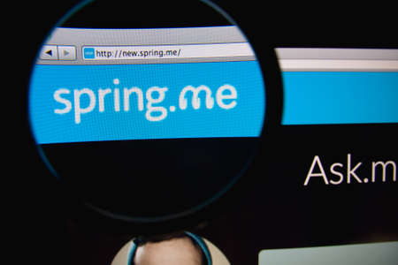 LISBON, PORTUGAL - FEBRUARY 21, 2014: Photo of Spring.me homepage on a monitor screen through a magnifying glass.