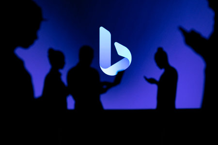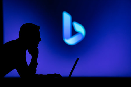 JAPAN, TOKYO. JANUARY 30, 2023: Bing Collaborating for Innovation: Silhouetted Web Developers in Action with Company Logo in Background