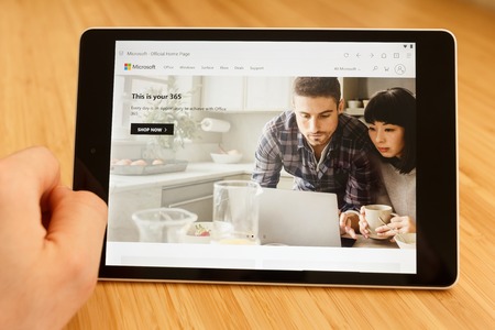 SAN FRANCISCO, US - 1 April 2019: Close up to hands holding tablet using internet and looking through microsoft web site, in San Francisco, California, USA. An illustrative editorial image