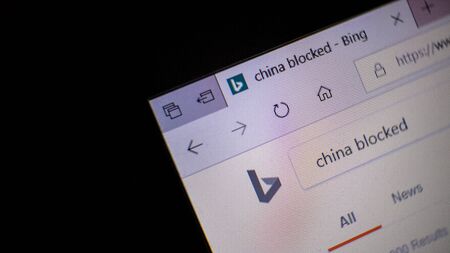 2019,1,28, USA, Detroit, A macro photograph of a computer screen with the text China blocked. Search engine site line with the Microsoft Bing logo. Shallow depth of field. Copy space. Blur. Selective focus.