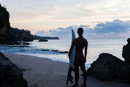 woman surfer with surfboard on tropical beach at sunset