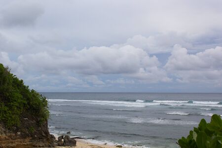 Tropical seascape. Ocean, waves and blue sky. Tropics. Beach and beautiful views of the cliffs, splashing waves and nature. Bali Island.