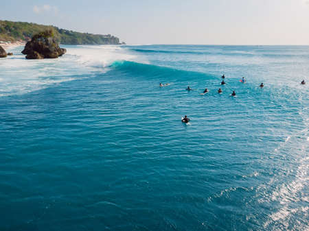 Surfers in blue ocean at Bali. Aerial view of tropical island with waves