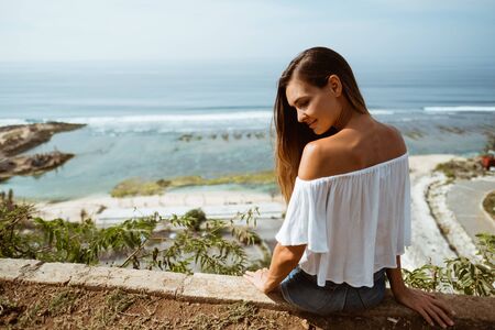 Traveller woman in swimsuit posing at sunset near ocean and rocks in Bali. Woman in bikini and amazing landscape
