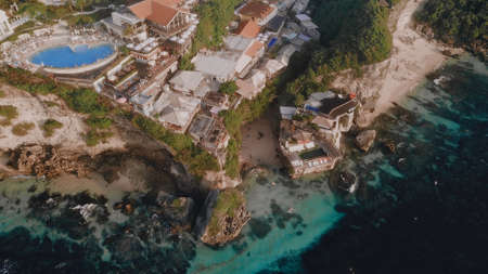 Uluwatu cliff with crystal blue water and gold beach in Indonesia. Bali landscape from top view from a mountain peak. Travel paradise destination for a couple in searching for adventure.