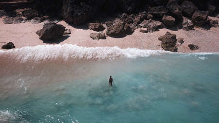 Young woman in a bikini at the white sand near the waves of blue sea. Bali, Indonesia. Aerial Shooting. Stunning tropical beach view. Top view aerial photo from flying drone of an amazingly beautiful