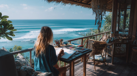 A young woman sits on a wooden terrace overlooking the ocean, sketching with pencils and paints. Surrounded by plants, waves, and sunlight, she enjoys a peaceful, creative moment in a tropical paradise