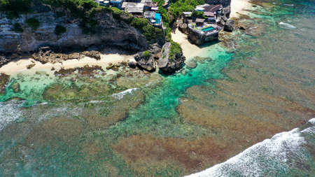 Aerial view of beauty Bali beach. Blue sea waves in Suluban beach Bali Island