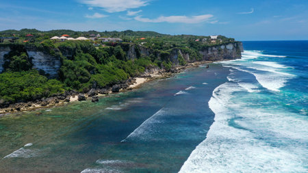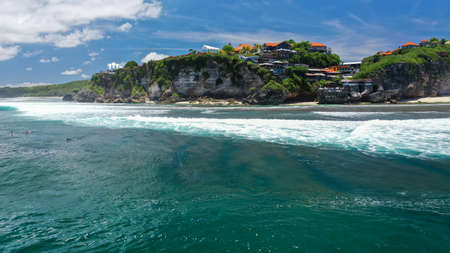Aerial view coast with sandy tropical beach. seascape ocean surf and tropical beach large waves turquoise water crushing on beach Melasti, Bali,Indonesia. Travel concept.